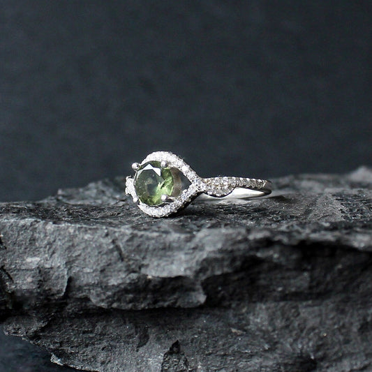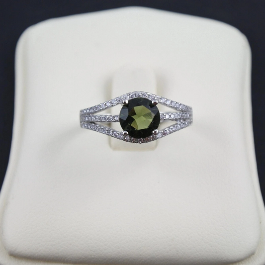 Silver Moldavite Ring 7 mm stone, Authentic Moldavite jewelry- Czech Genuine Moldavite gemstone ring, Faceted moldavite ring real moldavite