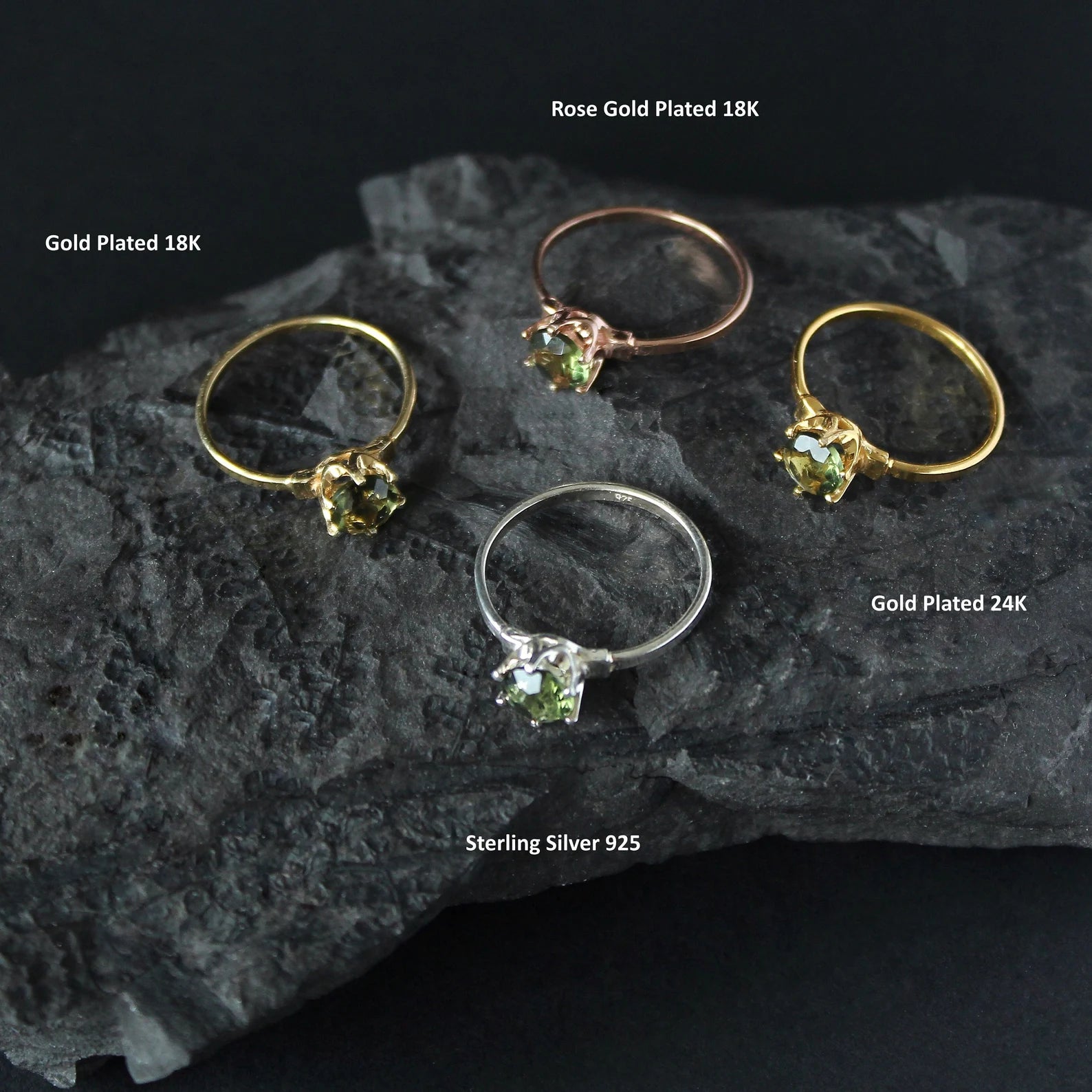 Genuine CZECH MOLDAVITE Ring 6 mm rounds stone. 925 Sterling Silver ring. Gold plated is a sterling silver 925 coated with 18K gold or 24K gold.