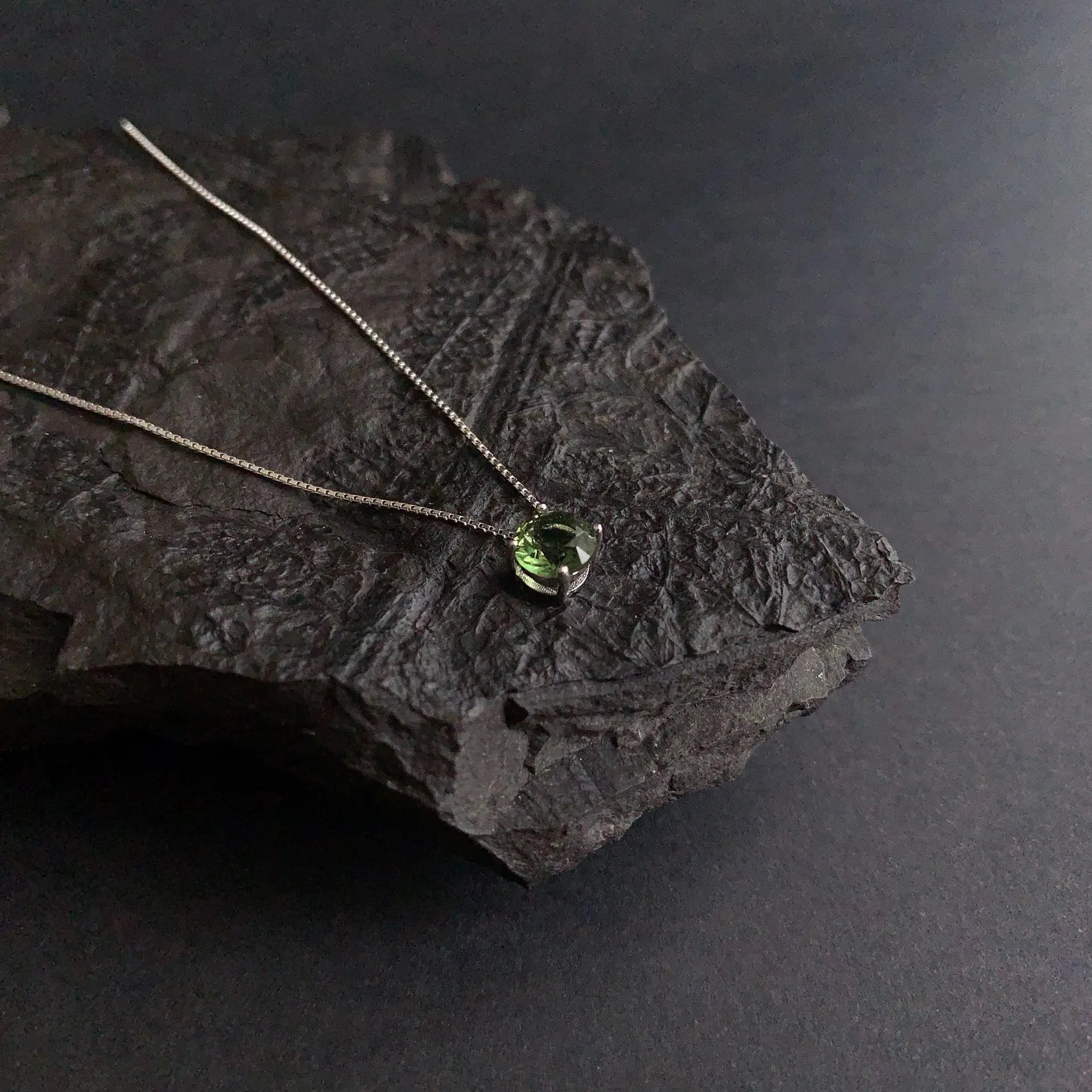 Genuine CZECH MOLDAVITE Faceted Gemstone Pendant 6 mm, approx. 0.66 ct round stone with Silver chain 42-45 cm(16-18’’). 925 Sterling Silver real Moldavite Pendant.