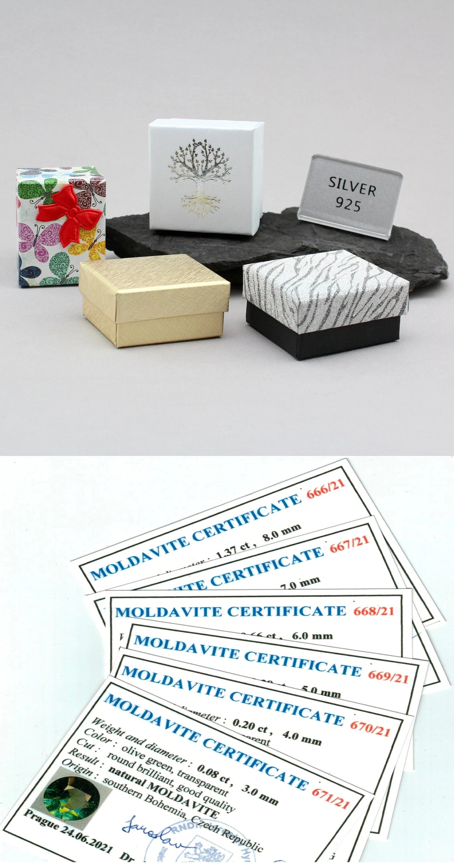 Gift-ready: Moldavite Jewelry is sent in gift boxes of various colors, similar to those in the last photo with a Certificate of Authenticity