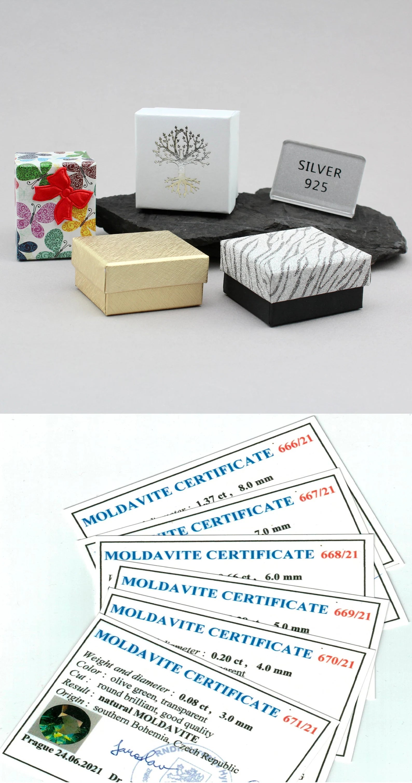 Gift-ready: authentic Moldavite Jewelry is sent in gift boxes of various colors, similar to those in the last photo with a Certificate of Authenticity