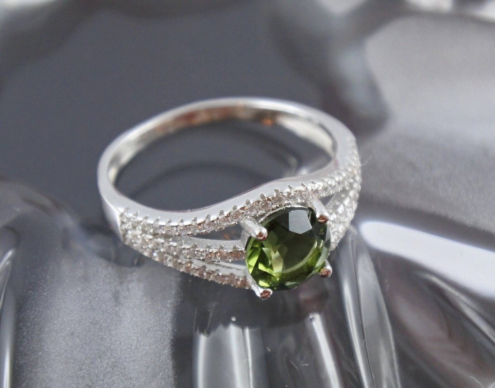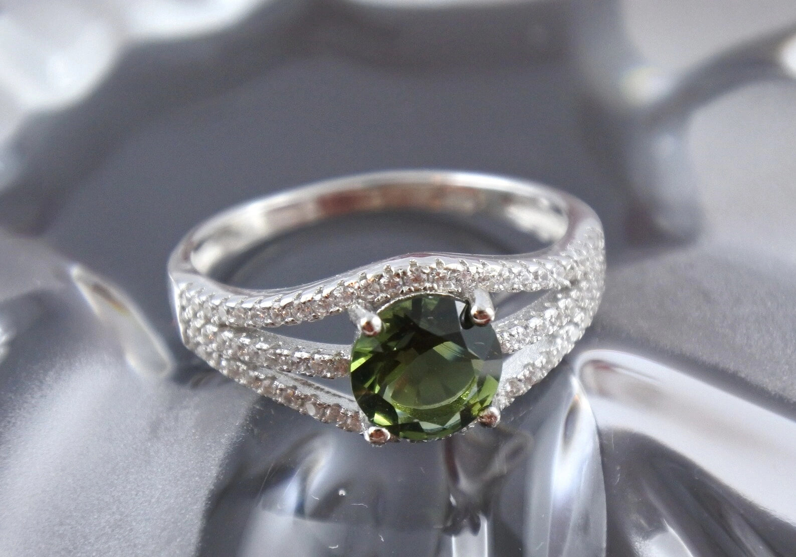 Authentic Moldavite ring- faceted moldavite ring 7 mm, approx. 1 ct Rounds stone. 925 Sterling Silver moldavite ring. Jewelry made of the highest quality silver, known as the 925 in jewelry. It is free of nickel, cadmium and lead.